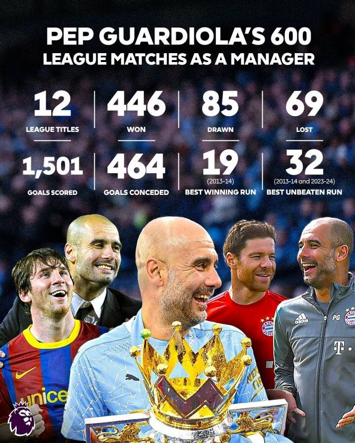 瓜迪奥拉执教生涯600场联赛纪录↓